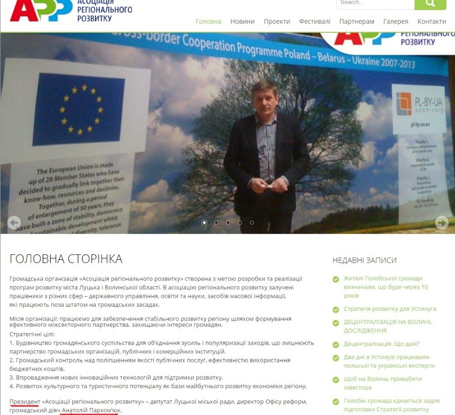 Переможець конкурсу - Волинське обласне громадське об´єднання «Асоціація регіонального розвитку» створене у 2012 році. ЄДР вказує, що керівником та підписантом у цій ГО є Гоцалюк Петро Павлович.