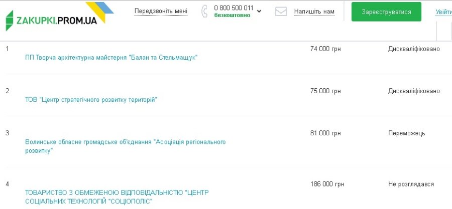 Втім іншого учасника - ООО «Центр стратегічного розвитку територій», який надав довідку про виконання аналогічних договорів, розроблені стратегії та пропозиції, дискваліфікували через «недостатній практичний досвід у розробці статегічних планів розвитку територій». До речі, цінова пропозиція цього учасника на 6 тисяч дешевша за пропозицію фірми-переможця.