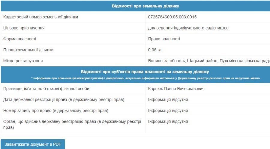 Саме вони є синами колишнього голови Волинської обласної ради Василя Дмитрука. Коли вони придбали ділянку чи отримали її – з кадастрової карти дізнатись неможливо, оскільки дані відсутні. Тим не менше Олег Дмитрук нині лишається при посаді начальником обласного БТІ, та знайти його декларацію нам не вдалося.