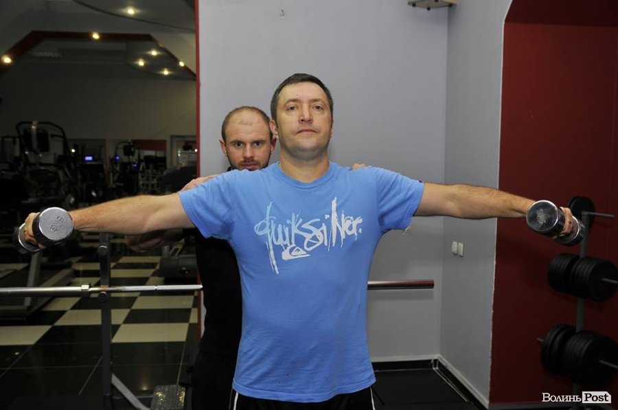 Потім фотограф взявся пропрацьовувати плечі. Почалося все із жиму у тренажері з вагою 15 кілограмів та махів у тренажері.