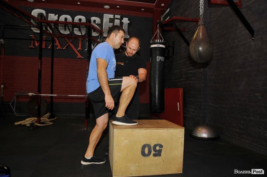 Першою вправою був підйом на тумбу висотою 50 сантиметрів на одній нозі. Вправу виконували в короткій амплітуді, аби максимально задіяти квадріцепс. Підходи фотограф виконував без «перекурів», аби ефективніше залучити кров до кінцівок.