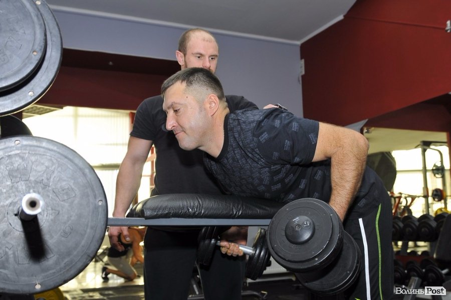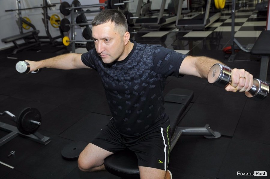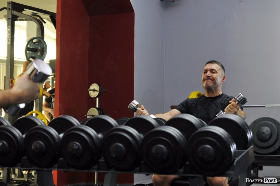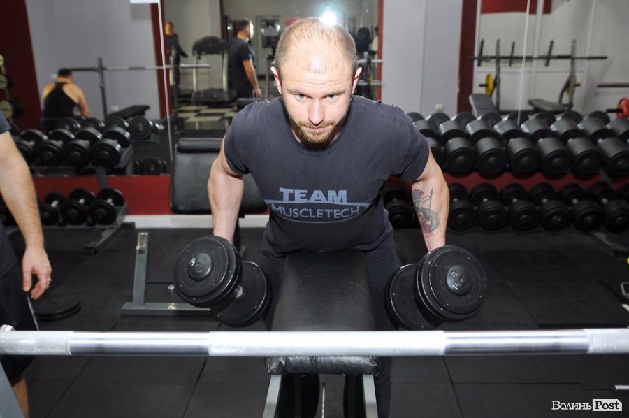 Далі Павло тягав гантелі зі спеціальної лавки. Фотографу дісталися гантелі по 14 кілограмів.