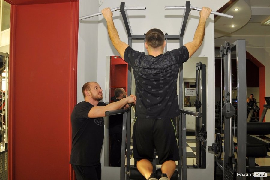 Павло сьогодні качав спину та плечі. Спершу Віталій продемонстрував пуловер стоячи з широким хватом, який Павло старанно повторив.