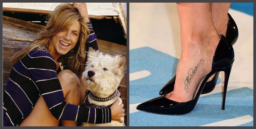 Тату присвячене своїм домашнім улюбленцям роблять і голлівудські кінозірки, як наприклад Дженіфер Еністон, яка на внутрішній частині ноги набила ім’я свого собаки, який прожив з нею 15 років, та завжди був вірним другом.