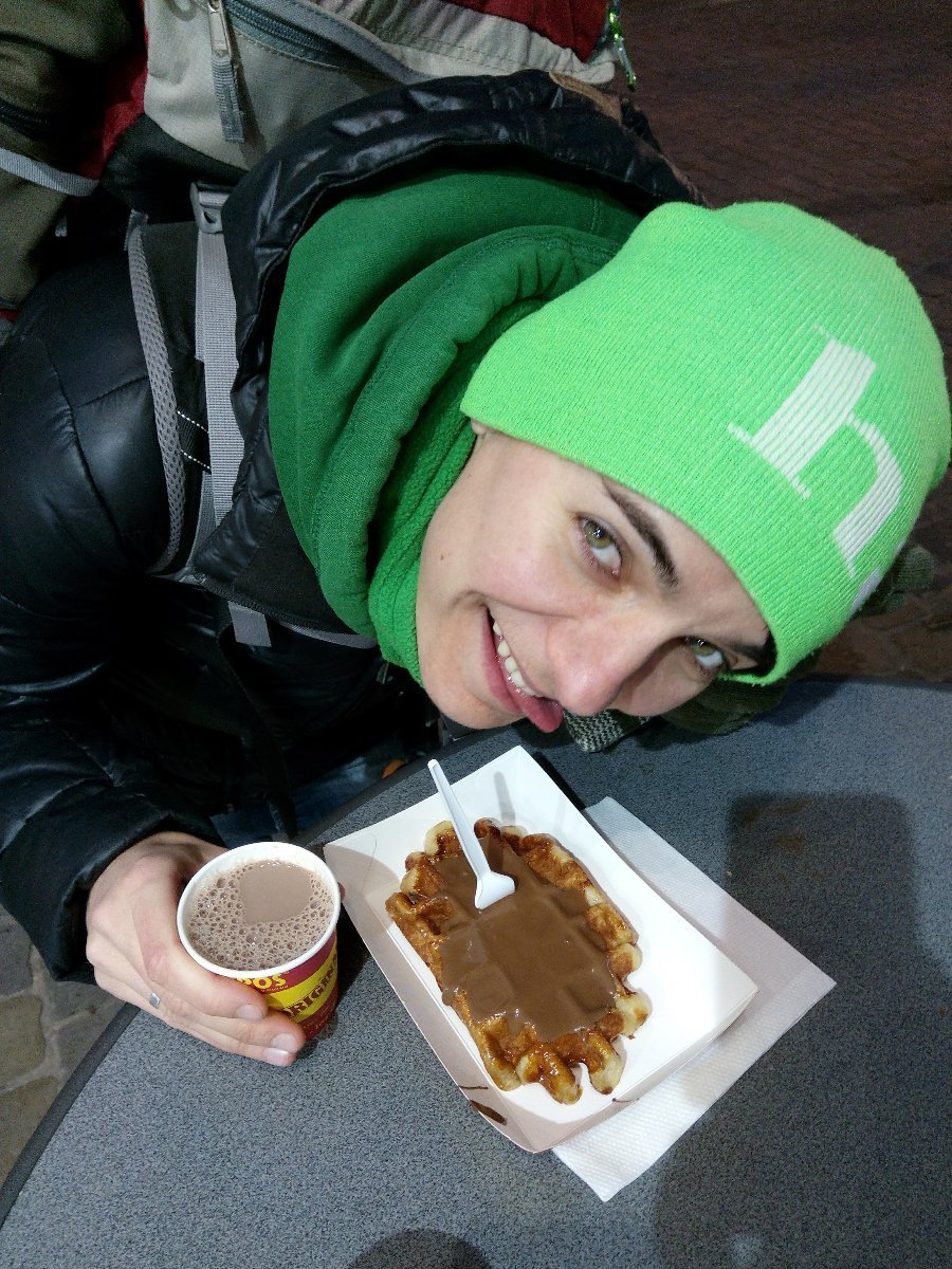 Олена: Мені дуже кортіло спробувати вафлю в Брюсселі для того, щоб «сфоткати» і викласти її у Фейсбук. Це такийс обі «хитрий план». У Луцьку, біля гіпермаркету «ТамТам» посеред вулиці продаються «бельгійські» вафлі, а мене огорнула ностальгія і я замовила її з нутеллою. Питаю в продавця, мовляв «де тут нутелла?», бо вона була настільки тонко намащена, що неозброєним оком − не розгледіти. А коли мені принесли в Бросселі вафлю просто налиту цією нутеллою – відчула різницю.