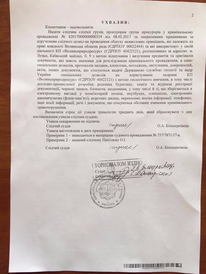 Як ідеться у постанові судді Печерського суду Києва Олега Білоцерківця, від управління з розслідувань особливо важливих справ у сфері економіки Департаменту з розслідувань особливо важливих справ у сфері економіки Генеральної прокуратури України надійшло клопотання по обшук «нежитлових приміщень» (фактично кабінетів у облраді), які використовує КП «Волиньприродресурс».
