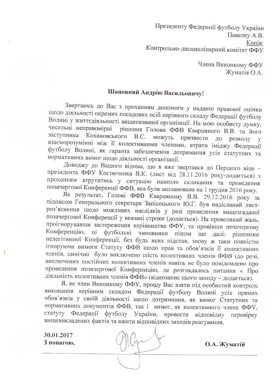 Тільки після цього я та член виконкому ФФУ від Волинської області Олександр Жуматій (кожен окремо) написали звернення до ФФУ з проханням дати належну оцінку діям голови ФФВ Віталію Кварцяному.