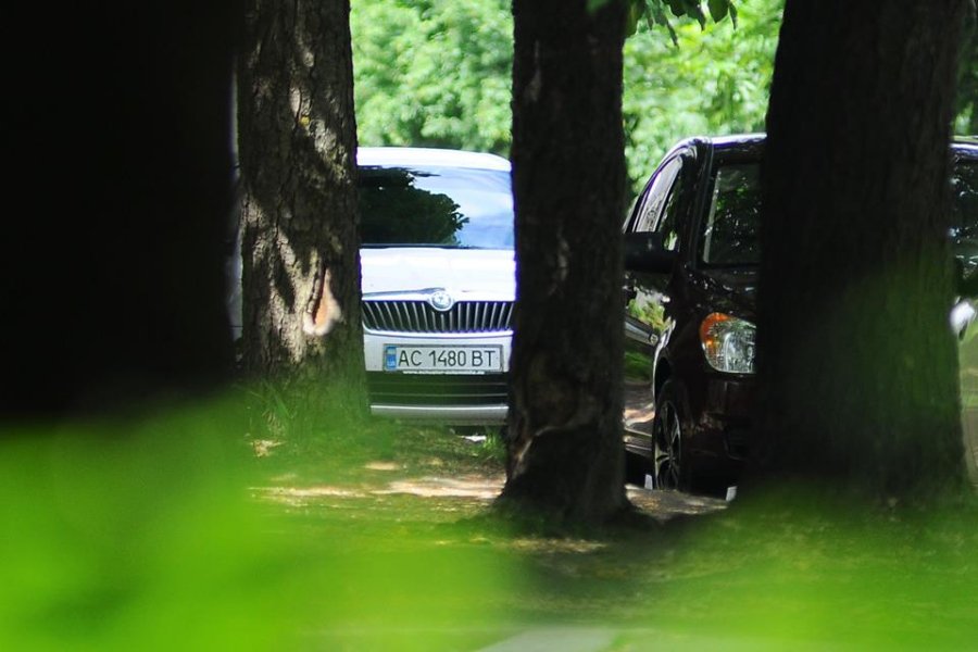 Передобідня пора. Юлія Вусенко йде до парковки. На зустріч їй з авто виходить Ігор Лапін. Вони стають біля білого авто Skoda Octavia (номерний знак АС 1480 ВТ) та розмовляють. Саме через це фото на "Волинських новинах" вийшло в такому ракурсі з шматком бокового дзеркала.