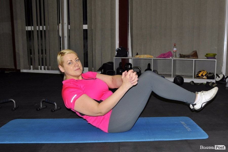 Далі жінка виконувала повороти корпуса, які тренують мускулатуру пресу.