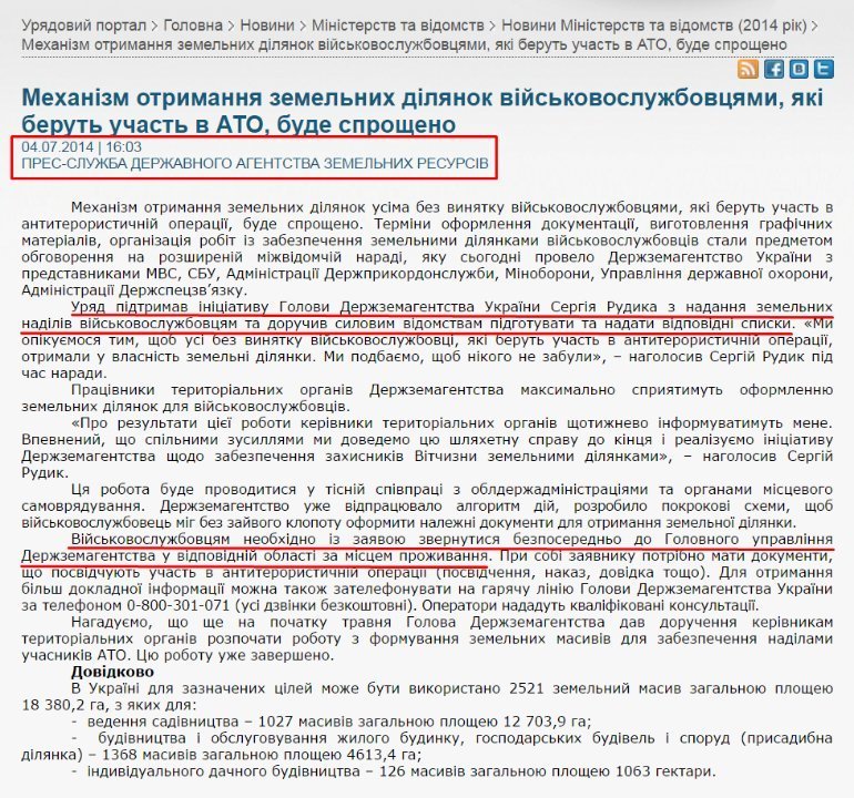 – Це й справді спільна ініціатива Держземагенства та Міністерства оборони, яку озвучив голова Держземагенства С. Рудик на брифінгу після розширеної міжвідомчої наради у липні 2014-го. Місцева влада дійсно не має відношення до того, що територіальні органи Держземагенства максимально сприятимуть оформленню земельних ділянок для військовослужбовців. Бійцям необхідно звертатись до головного управління Держкомземагенства в області. Далі йшли чіткі інструкції для територіальних органів Держземагенства.