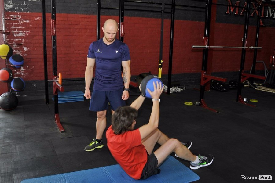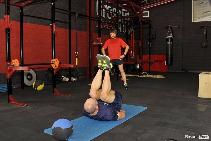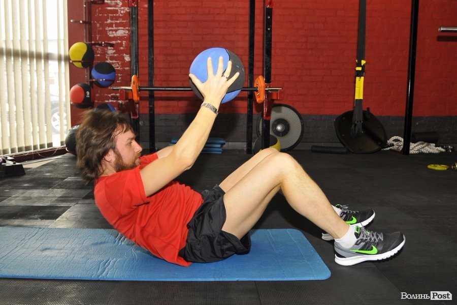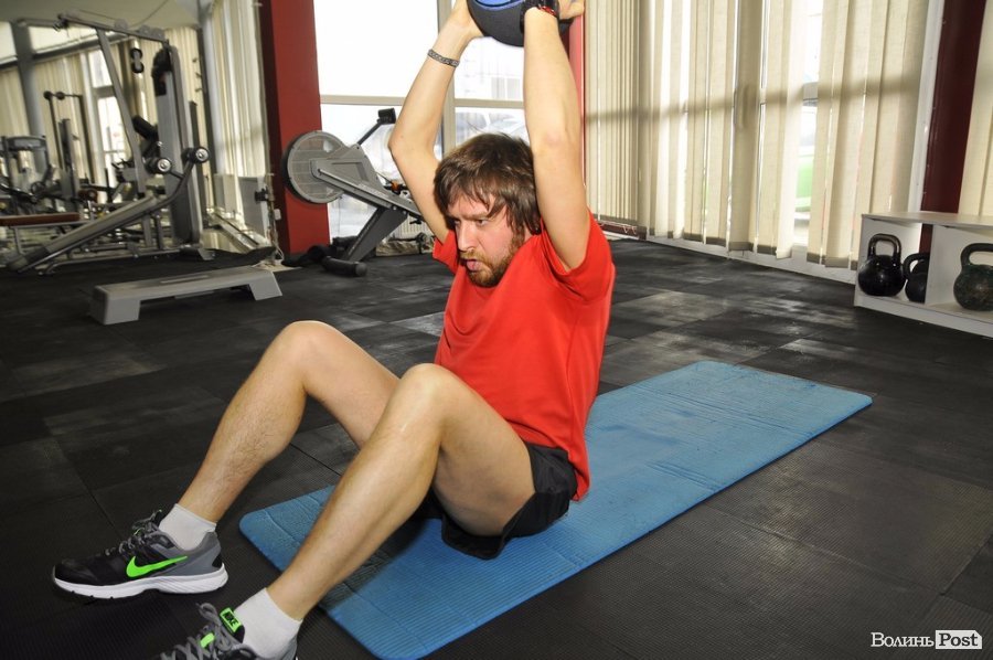 Першою вправою для Олександра було качання пресу із м'ячем масою 5 клограмів.