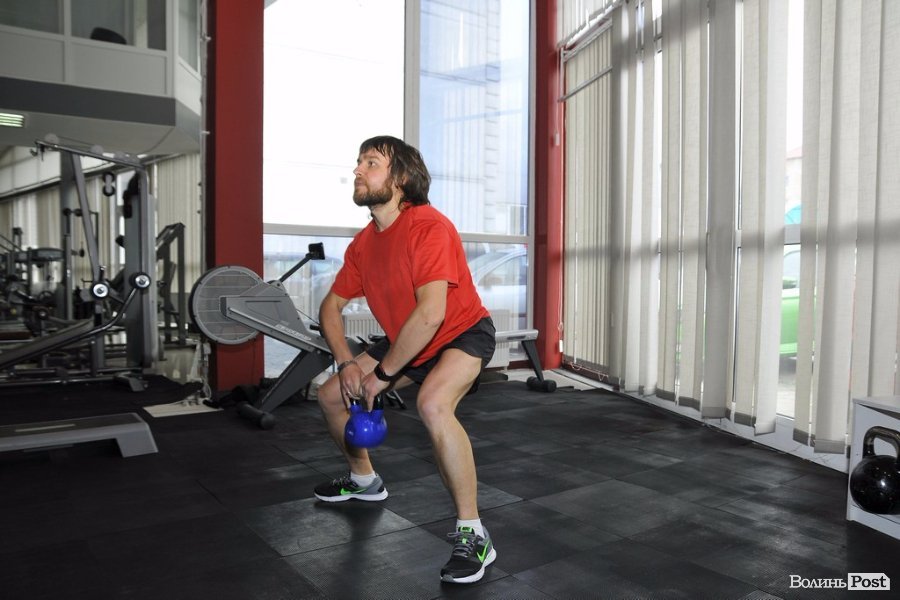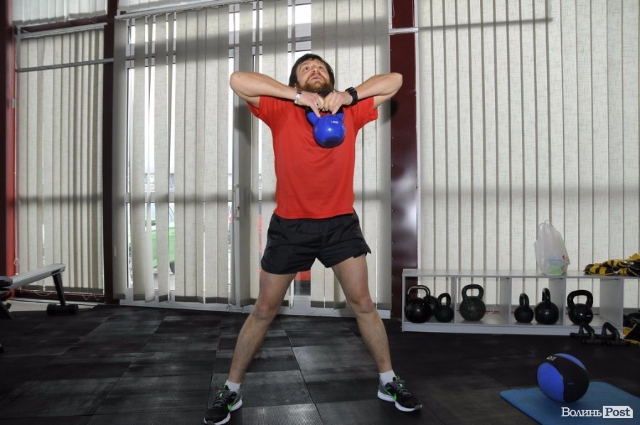 Далі чоловік виконував присяд з жимом штанги масою 13 кілограмів.