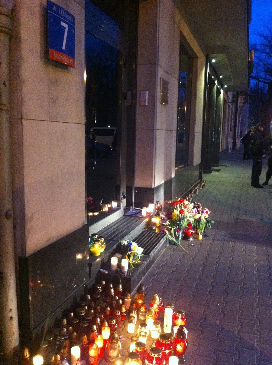 20 лютого на Посольстві України, поряд із прапором України, з'явилася чорна стрічка. Дипломатична установа 24 години на добу охороняється польською поліцією.