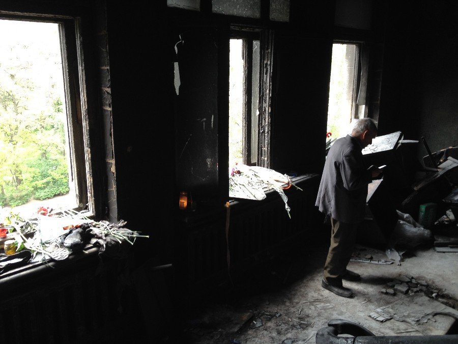 Третій поверх, вікна на задній двір. З них люди вистрибували, рятуючись від вогню. Близько десяти чоловіків загинуло, багато поранених. Чому вони не пішли в бокові корпуси теж не відомо.