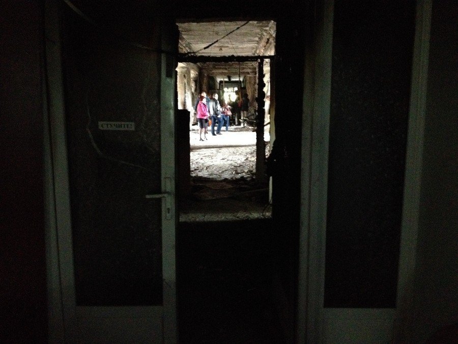 1 поверх. Вид від центрального входу (де була пожежа) в бік правого крила. Як бачите, коридор не пошкоджений вогнем. І так точно на трьох поверхах (вище я не піднімався). Залишається питання: чому люди раптово згоріли на сходах і не втекли в праве та ліве крило?