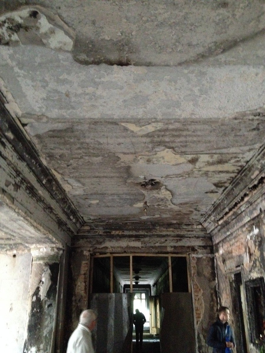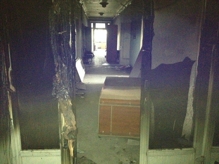 1 поверх. Вигляд з правого крила в бік центрального входу. Пожежа була лише до цих дверей.