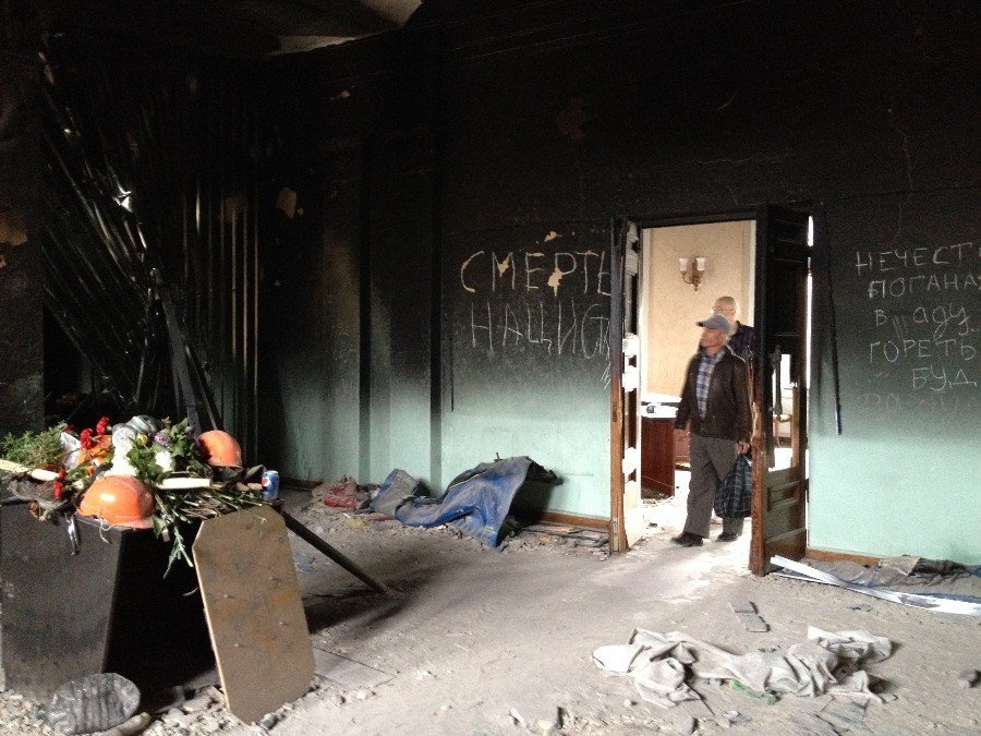 А тепер трішки розслідування. Була версія, що приміщення загорілося з-середини ще до того, як його почали палити ззовні. Як доказ наводили ось це відео (приблизно з 2-ї хвилини): http://youtu.be/s9AMjLBIliw?t=1m59s