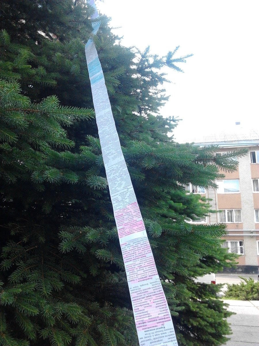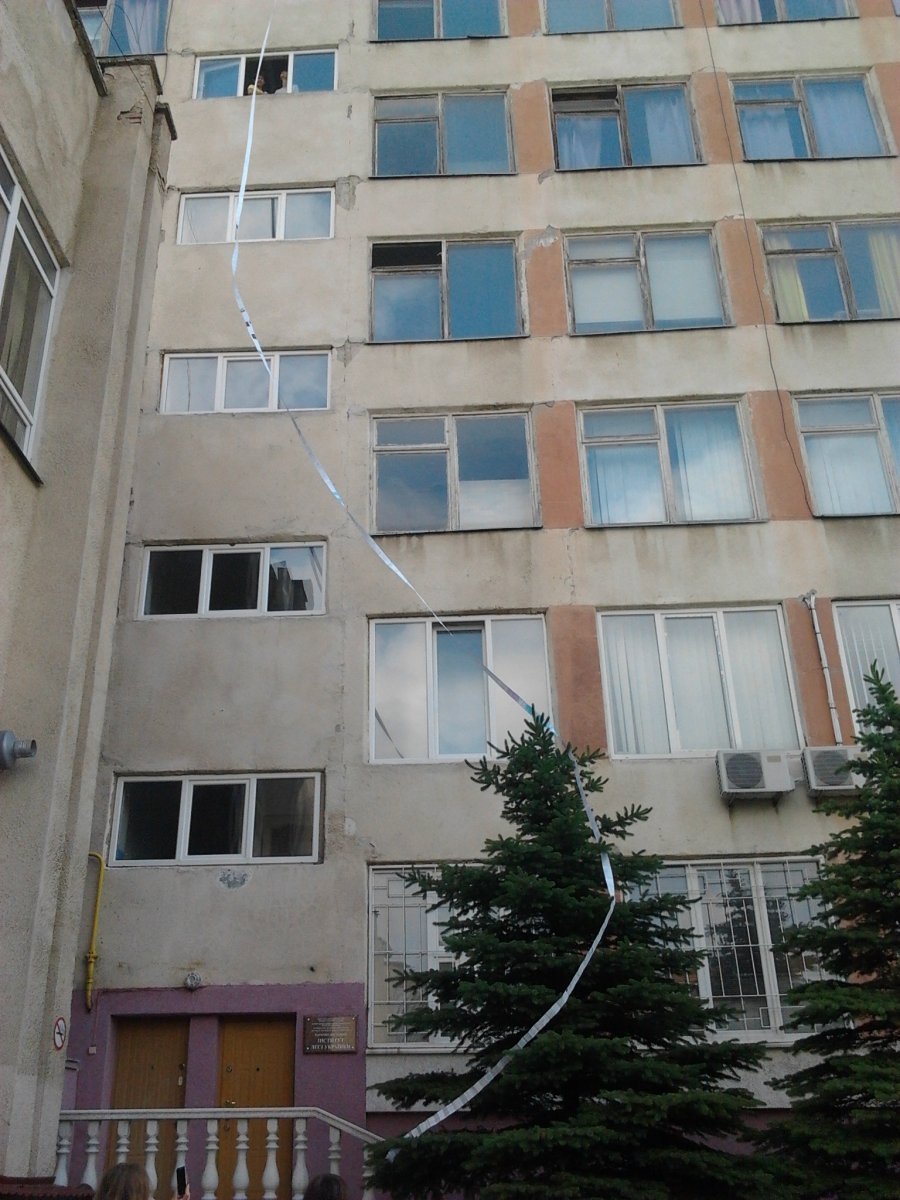 Сьогодні студенти ВНУ ім. Лесі Українки, та й прості перехожі спостерігали цікаве, та дещо непередбачуване явище. З вікна 8-го поверху лабораторного корпусу університету звисала величезна шпаргалка (не чітко, але на фото видно довгу білу стрічку – це і є те саме диво студентського розуму).