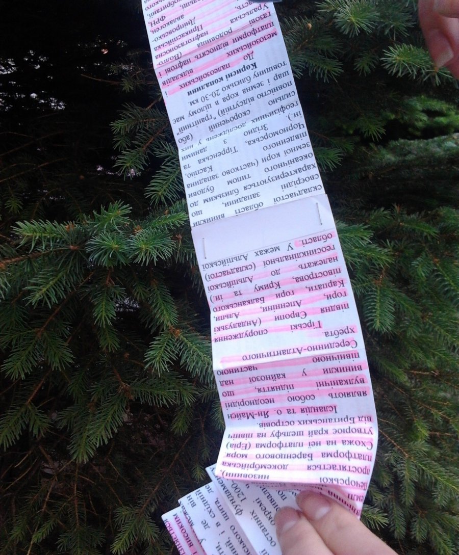 Власник шпаргалки витратив, мабуть, дуже багато часу, аби роздрукувати та скріпити до купи необхідні відповіді на екзамену з географії, а також попідкреслювати найважливіше в тексті.
