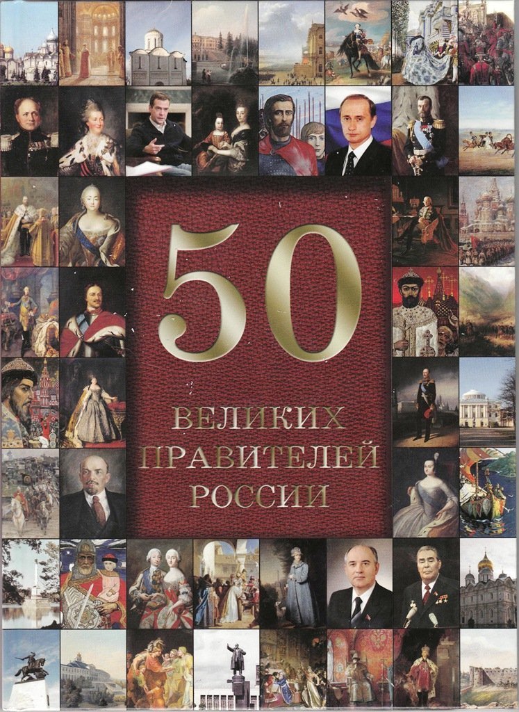 Але згодом, погляд затримався на одній великій і яскравій книжці з інтригуючою назвою – «50 великих правителей России». Виявляється – це «иллюстрированная єнциклопедия», що вийшла у видавництві «Белий город» в Москві у 2011 році. Як професійний історик, відразу глянув на зміст, що в кінці книги. Там із кольорових світлин виступають В.Путін і Д.Медведєв, М.Горбачов і М.Хрущов, Й.Сталін і В.Ленін, царі – Микола 11 і Олександр 111 і т. д. Тобто, справжніх «великих правителей России», де у яскравих картинках висвітлюються їх політичні діяння по «собиранию русских земель» . Особливо ілюстровані та розписанні Іван Калита та Іван Грозний, Петро 1 та Катерина 11. Яскраві ілюстрації доповнюють про їх «героїчну» місію.