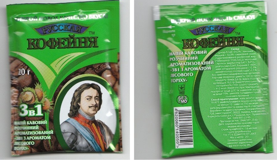 Його портрет на кольоровій обгортці з крикливою назвою: «Русская кофейня». Далі читаємо: «3в1, новий кавовий напій розчинний, ароматизований з ароматом лісового горіха». Одне слово на українській, друге – на російській мові. Хто ж випускає такий «ароматизований напій»? ТОВ «Інвестпроект», який знаходиться в селі Проліски Бориспільського району Київської області. І гасло поставили: «Відкрий нову якість смаку!».