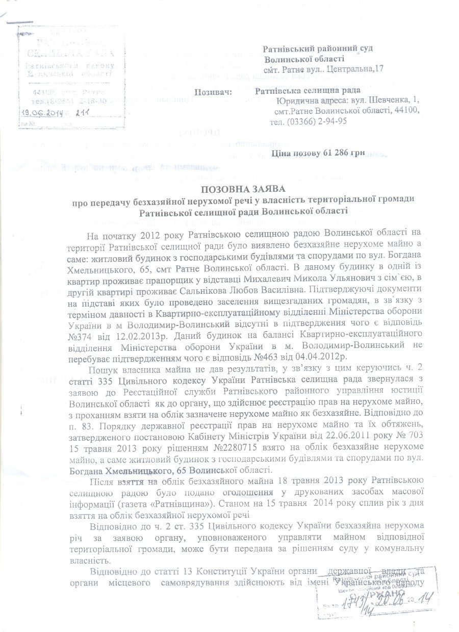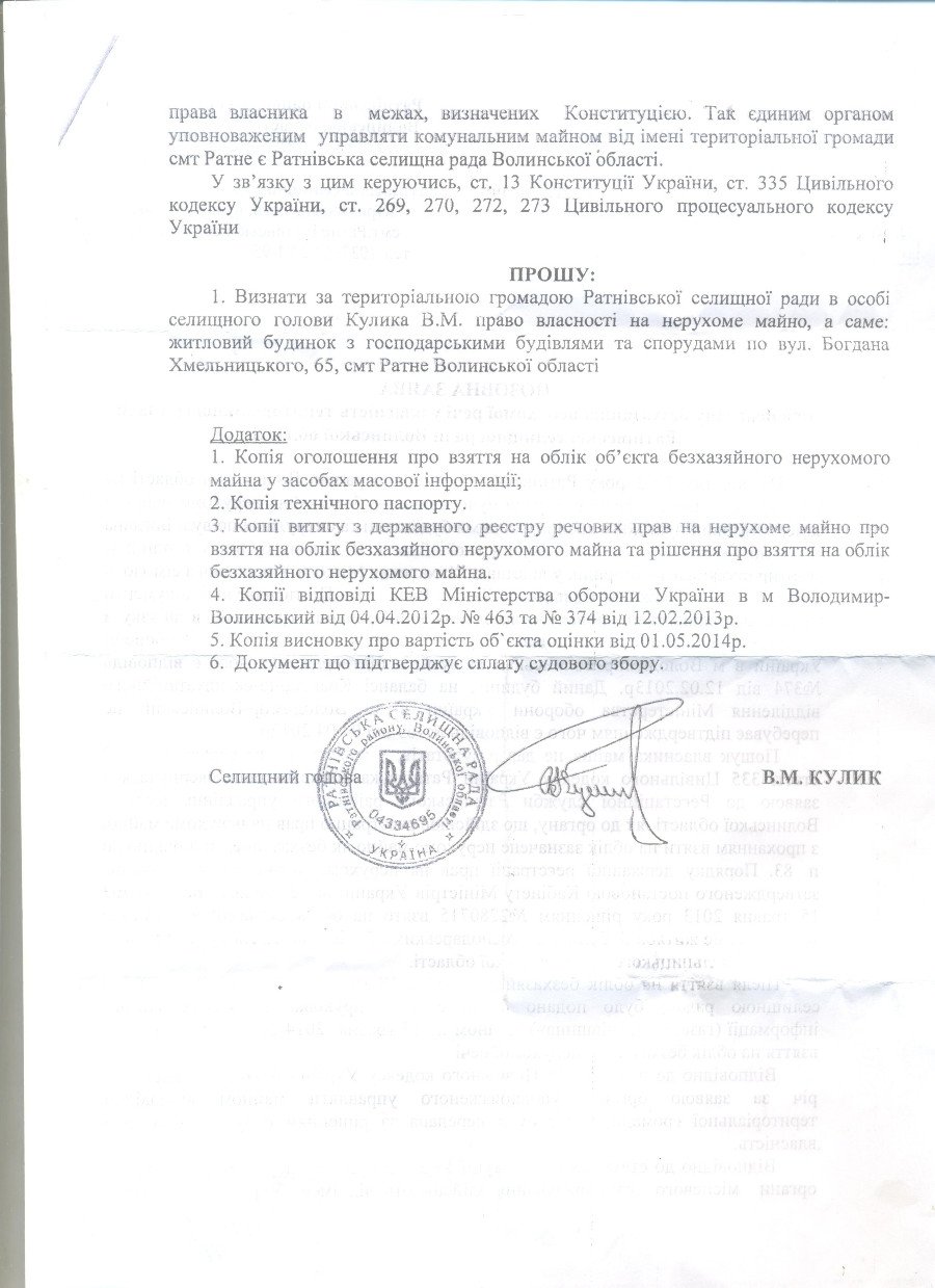 Із даного позову випливає, що на початку 2012 року Ратнівською селищною радою на території ради було виявлено безхазяйне нерухоме майно, а саме: житловий будинок з надвірними будівлями і спорудами (!) і це притому що В.Кулик є сільським головою з 2006 року лише у 2012 році виявив безхазяйне майно.