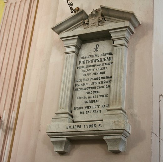 Міститься в костелі епітафія 1863 року батькові Габріели Запольської, маршалку луцької шляхти Вінцентію Пьотровському. Барельєф з епітафією, виконаний у стилі класицизму з білого мармуру, увінчаний гербом Корвіна. Основна впізнавана деталь цього герба – ворона, яка сидить на колоді з кільцем у дзьобі. Вважається, що герб походить від римського консула 30-х років до нашої ери Марка Аврелія Корвіна.
