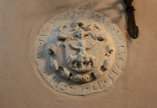 Розповідь про ці вельми цікаві старожитності я просто не маю права завершити в дусі того, що побачити на власні очі все це просто так не можна, бо воно заховане. Але сталося так, що один з найцікавіших артефактів можна уздріти в самісінькому публічному просторі храму, межи двох нав. І не тільки уздріти, а й навіть дотикнутися пальцями (дуже обережно і ніжно). Між центральною і правою навами уже біля самого пресвітерію на стіні розміщений круглий барельєф. Він виготовлений на початку XVII століття (!!!). Це – власна єпископська печатка єпископа Павла Волуцького, який сприяв будівництву костелу єзуїтів. Волуцький здобув освіту в Римі, працював у канцелярії короля Сигізмунда ІІІ Вази, був послом до Папи римського, потім єпископом луцьким.