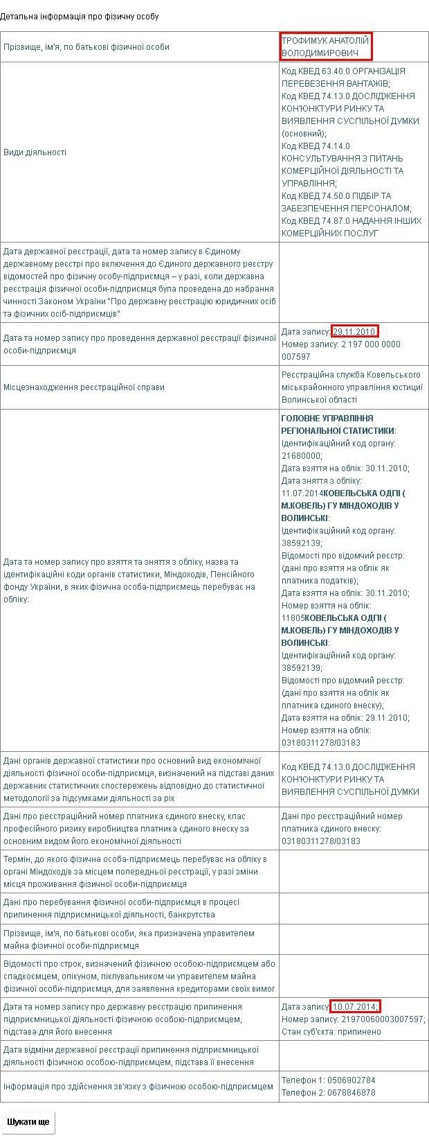 Як стало відомо з публічних джерел, 10 липня 2014 року фізична особа-підприємець Трофимук Анатолій Володимирович (на фото) офіційно припинив свою підприємницьку діяльність, якою займався з моменту державної реєстрації, а саме з 29 листопада 2010 р. Серед зареєстрованих ним видів діяльності значиться організація перевезення вантажів, дослідження кон’юнктури ринку та виявлення суспільної думки (основний), консультування з питань комерційної діяльності та управління, підбір та забезпечення персоналом, надання інших комерційних послуг.
