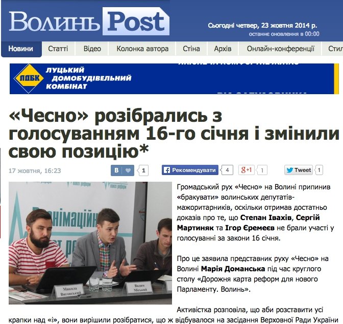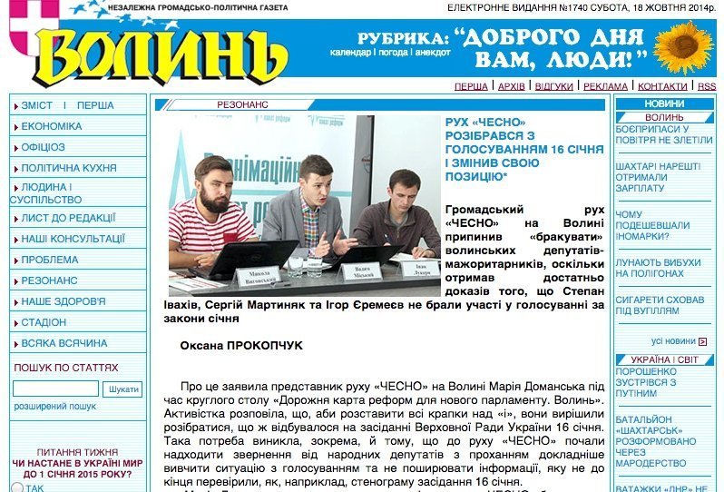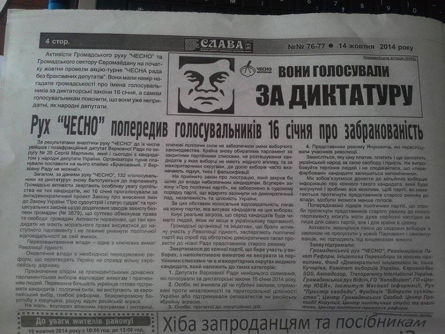 Насамкінець. Громадський рух ЧЕСНО перший підняв питання голосування 16-го січня. Хоч усі прекрасно в області знали, про голосування 16 січня, хто голосував, і як голосував, та ніхто крім нас не шукав відповідей на питання, що постали перед суспільством і не піднімав це питання завчасно. Але, коли прийшли вибори… Всі могли розібратися ще навесні, після кривавих подій на Майдані. Але ні інші громадські середовища, ні ті самі кандидати на наші акції та круглі столи щодо цього питання не приходили., де могли б висловити свої думки, позиції, подебатувати з конкурентами особисто. Слабо, друзі? Натомість робота відбувається кулуарно і ширяться чутки про наш рух. Мовляв ми продалися. І тільки за те, що говоримо про речі такими, якими вони є насправді. Здається, той, хто може подумати про наш продаж, зрозуміло оцінює речі по собі. Чи не так?