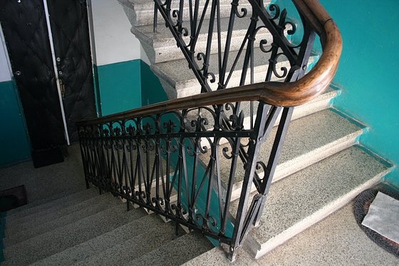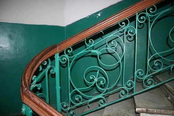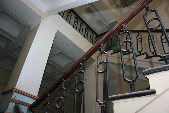 Один із сходових коридорів у будівлях того стилю - в приміщенні нинішнього Укртелекому на Кривому Валу. Оригінальний під'їзд з чорного і білого мармуру та з автентичними дерев'яними перилами на металевих ніжках, клепаних без зварювання - тут у тридцятих була Каса земельних спілок.