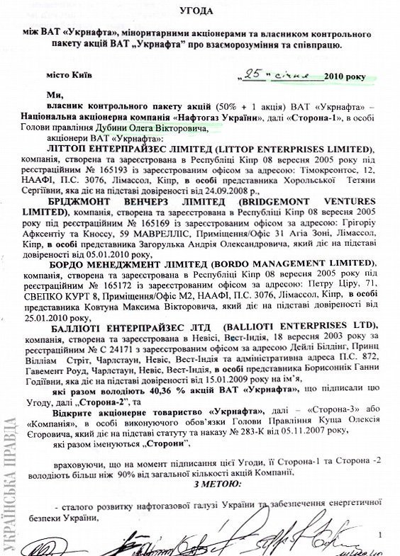 25 січня 2010 року, між першим та другим турами виборів президента, був підписаний документ, який безстроково фіксував інтереси Ігоря Коломойського в управлінні компанією "Укрнафта", контрольний пакет якої належить державі. Про існування такого договору давно ходили чутки, але ми вперше публікуємо сам його текст.