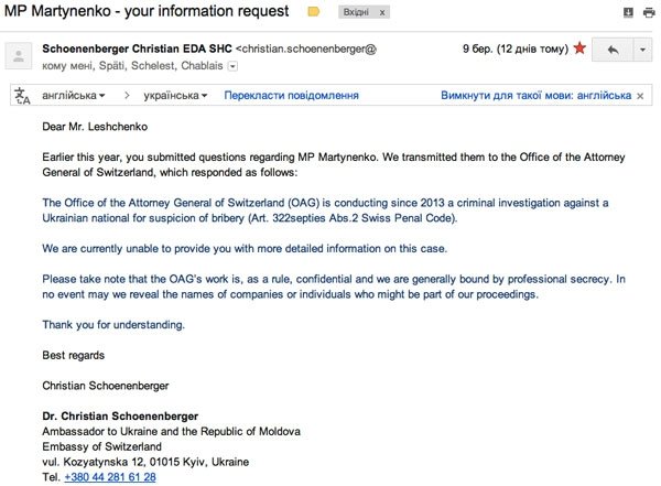 Раніше цього року, ви направили запит щодо депутата Мартиненка. Ми переправили його до офісу Генерального прокурора Швейцарії, який відповів таке: