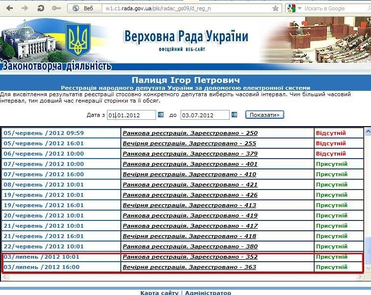 І, о диво, саме у цей день і приблизно у цей час, якщо вірити даним системи "Рада" нардеп Ігор Палиця справно реєструється у парламенті та голосує за різні законопроекти.