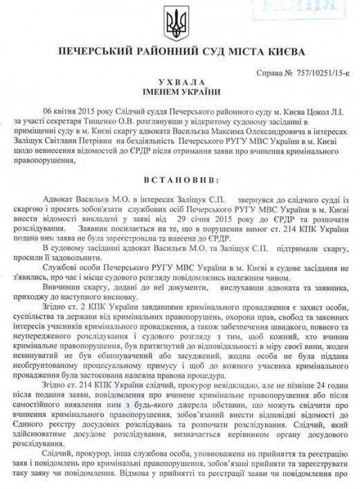 Попри очевидну підробку документів Хорошковським, Печерський райвідділ міліції відмовився реєструвати заяву про злочин та починати розслідування. І у понеділок за скаргою Світлани Заліщук Печерський райсуд зобов'язав їх провести слідство.