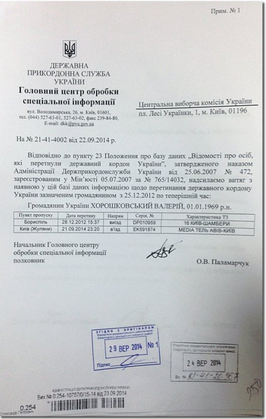 В рамках суду щодо зняття Хорошковського з виборів ми не змогли отримати докази, які підтверджували би його "відрядження" в Монако – зокрема, нарахування йому зарплати та утримання податків, а також документів, що підтверджують перебування працівника у місці відрядження: транспортні квитки, готельні рахунки тощо (регулюється листом Мінфіну України від 04.05.2011 р. N31-07230-16-25/11433, листом ДПАУ від 18.06.2011 р. N11327/6/15-0516) .