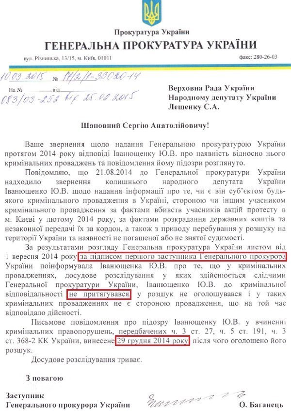 При чому, як розповідають джерела в Генпрокуратурі, на середній ланці пропонували окремо зауважити в листі, що Генпрокуратура не може стверджувати, чи ведуться справи проти Іванющенка в територіальних підрозділах прокуратури або інших правоохоронних органах.