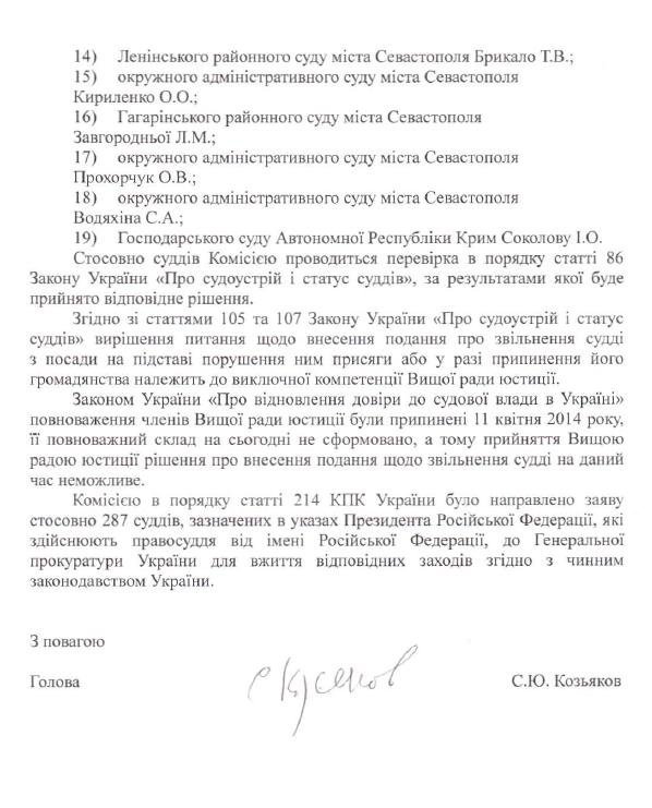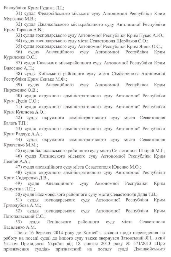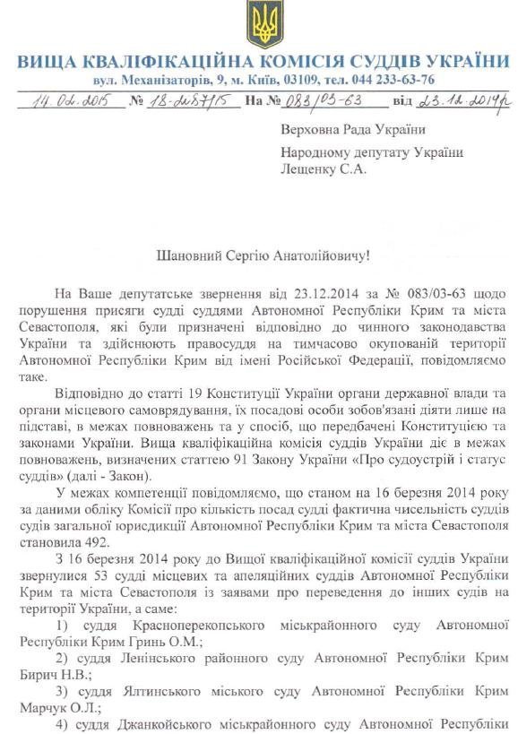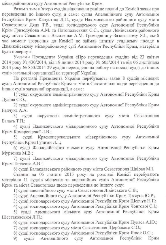 5 травня 2015 року направив звернення до Вищої кваліфікаційної комісії суддів внести рекомендації до Вищої ради юстиції щодо звільнення вказаних суддів з посад.