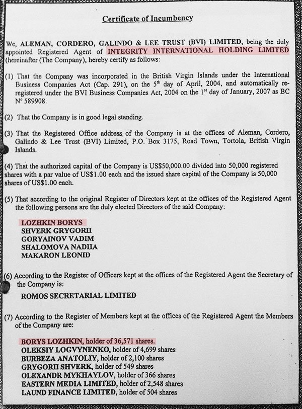 Ложкин, Шверк и Шиян фигурируют в уголовном деле как лица, имеющие права подписи в компании INTEGRITY INTERNATIONAL HOLDINGS LTD, зарегистрированной на Британских Виргинских островах.