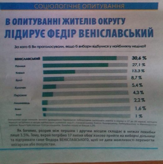 Але от дочекалися рейтингу з інформаційних матеріалів кандидата Федора Веніславського. На перших фотографіях у Фейсбуці нечіткий малюнок не дав змоги побачити картину, ясно було лише хто себе хвалить. Але згодом у блоці новин Інтернету ситуація прояснилась. Отож, пройдемося по пунктах.