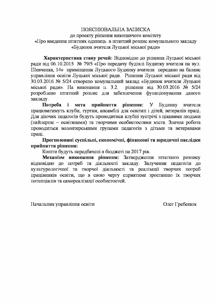 На сьогодні пропонується ввести до штатного розпису 5,5 штатних одиниць, а саме - директор, керівник гуртка, керівник художній, практичний психолог, робітник з комплексного обслуговування й ремонту будівель, прибиральник службових приміщень. Потреба і мета у таких працівниках, згідно пояснювальної записки Гребенюка О.В., зумовлюється необхідністю організації праці творчих колективів працівників освіти та гурткової роботи. Висновок напрошується наступний і дуже сумний – для управління освіти важливіше забезпечити дозвілля та комфорт вчителів, ніж виховання підростаючого покоління.