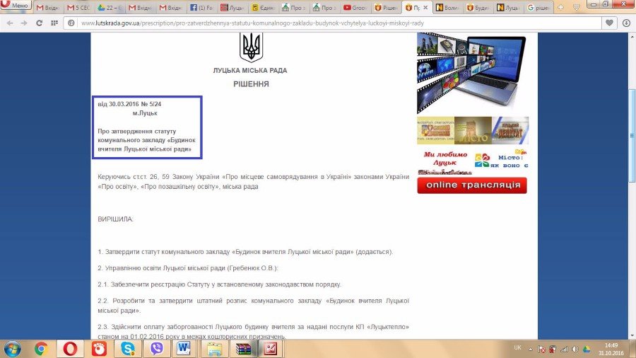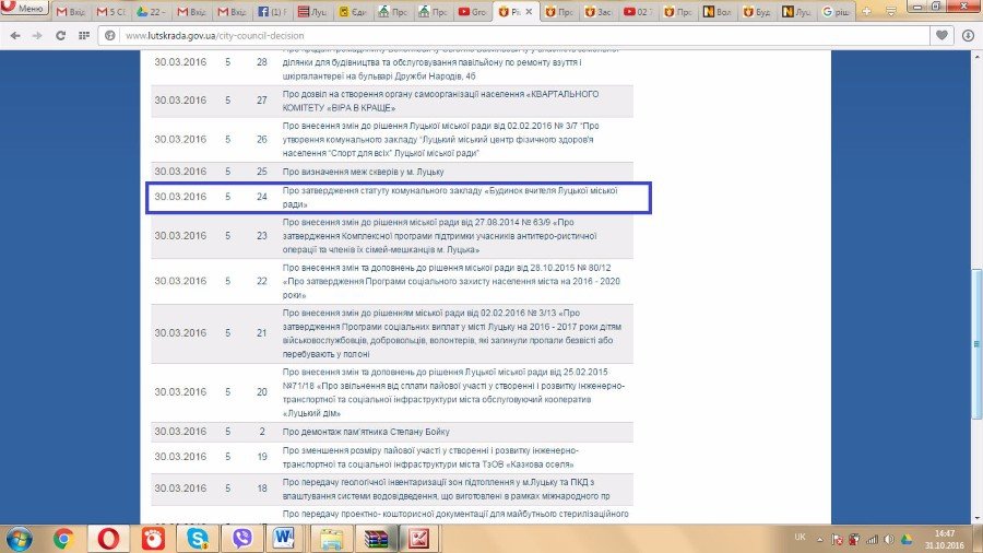 2. У проекті рішення начальник управління освіти Гребенюк О.В. посилається на рішення міської ради № 5/24 від 30.03.2016 «Про створення комунального закладу «Будинок вчителя Луцької міської ради» та затвердження його статуту». Та цікава деталь, на сайті міської ради такого рішення не має. Натомість під № 5/24 від 30.03.2016 міститься рішення «Про затвердження статуту комунального закладу «Будинок вчителя Луцької міської ради».