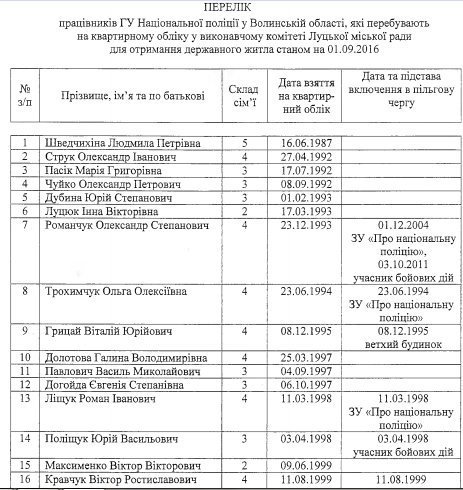 Одним із претендентів на житло є Юрій Столярчук, який призначений начальником Ківерцівського відділу поліції ГУНП в післяатестаціний період. У списку вказано, що він перебуває у черзі на житло з 28 вересня 2015 року згідно ЗУ «Про національну поліцію». Серед членів сім`ї вказана лише одна особа.