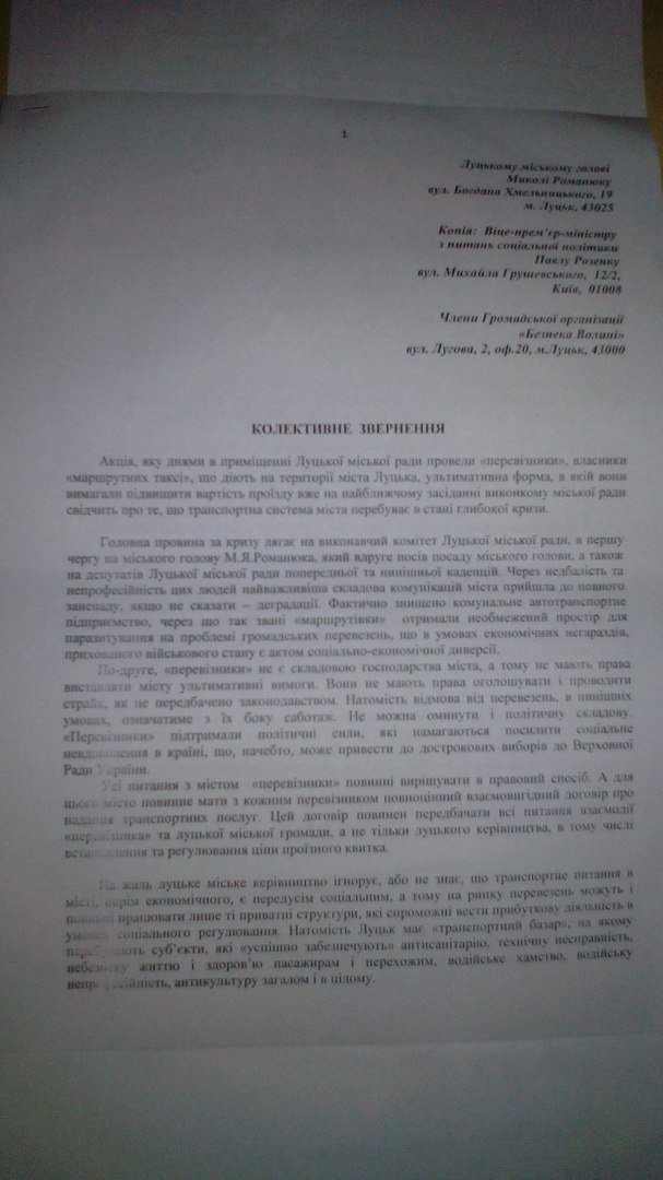 Акція, яку днями в приміщенні Луцької міської ради провели «перевізники», власники «маршрутних таксі», що діють на території міста Луцька, ультимативна форма, в якій вони вимагали підвищити вартість проїзду вже на найближчому засіданні виконкому міської ради свідчить про те, що транспортна система міста перебуває в стані глибокої кризи.