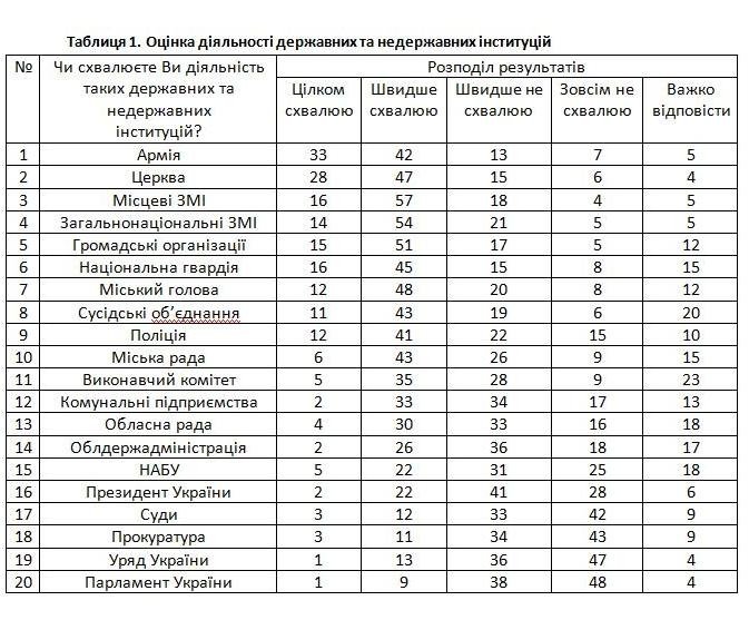 Три чверті інституцій, що оцінювалися, представляють різноманітні державні органи. Проте у першій десятці рейтингу державних і недержавних структур порівну. Солідні позиції займають силові структури - армія, Національна гвардія України, поліція. З органів влади найкращі результати були у міського голови (оцінка роботи Миколи Романюка) – 60% схвальних відгуків та міської ради – 49%.