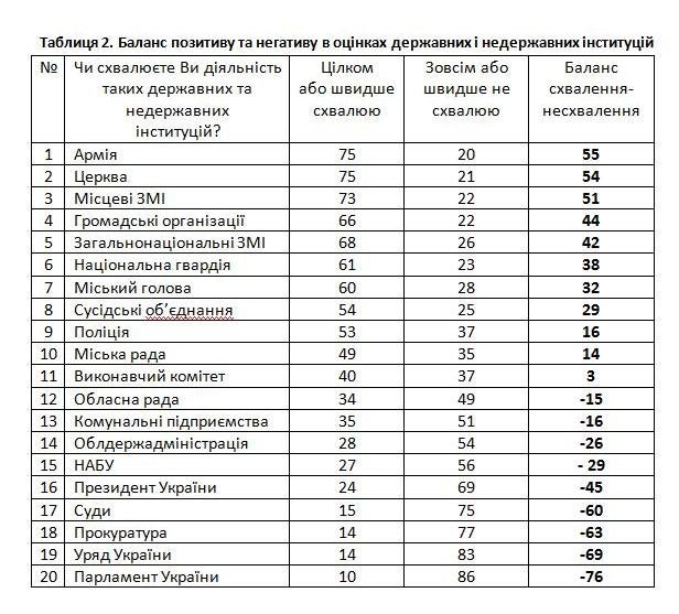 Найбільш позитивні оцінки надалі за армією та церквою. Вони отримали загалом по 75% однозначно або переважно схвальних оцінок.