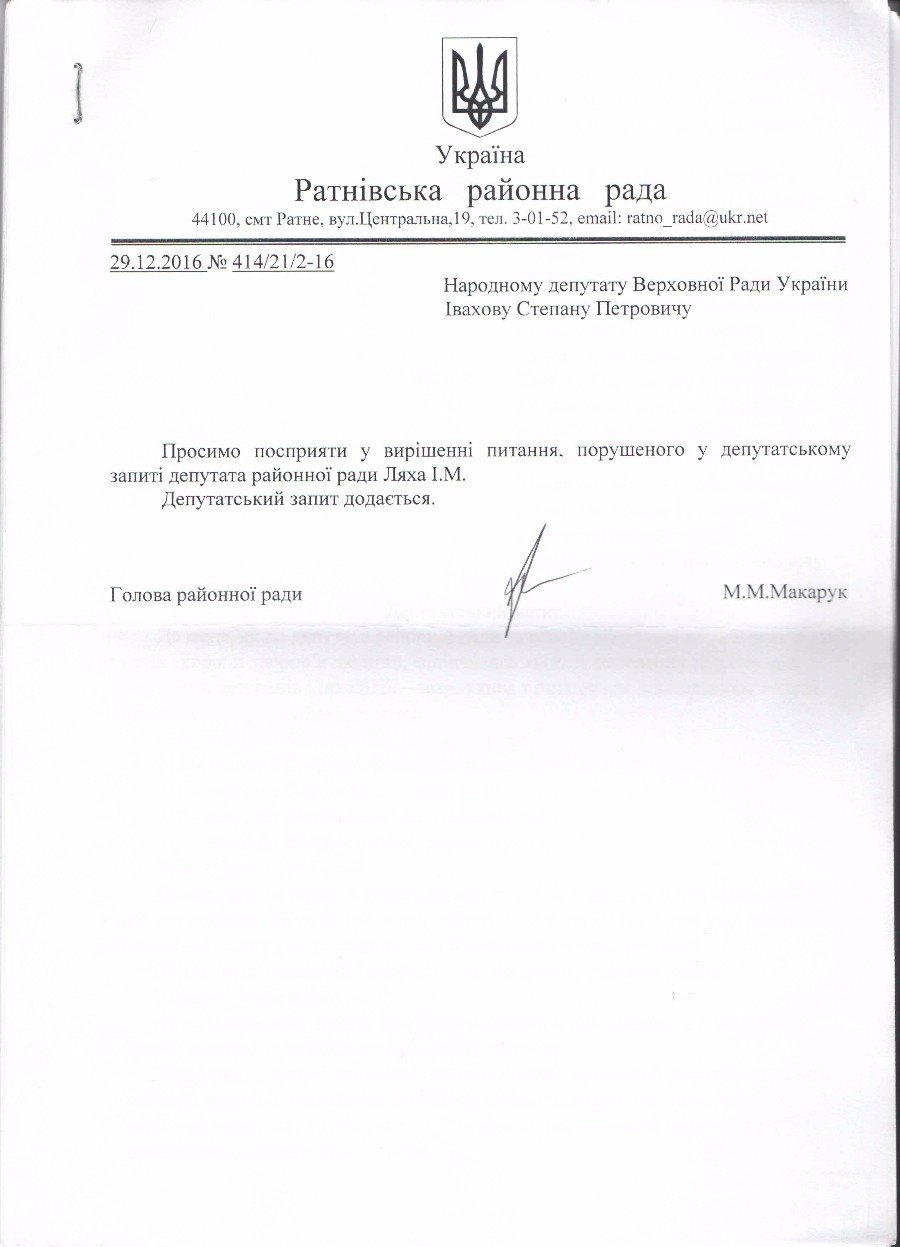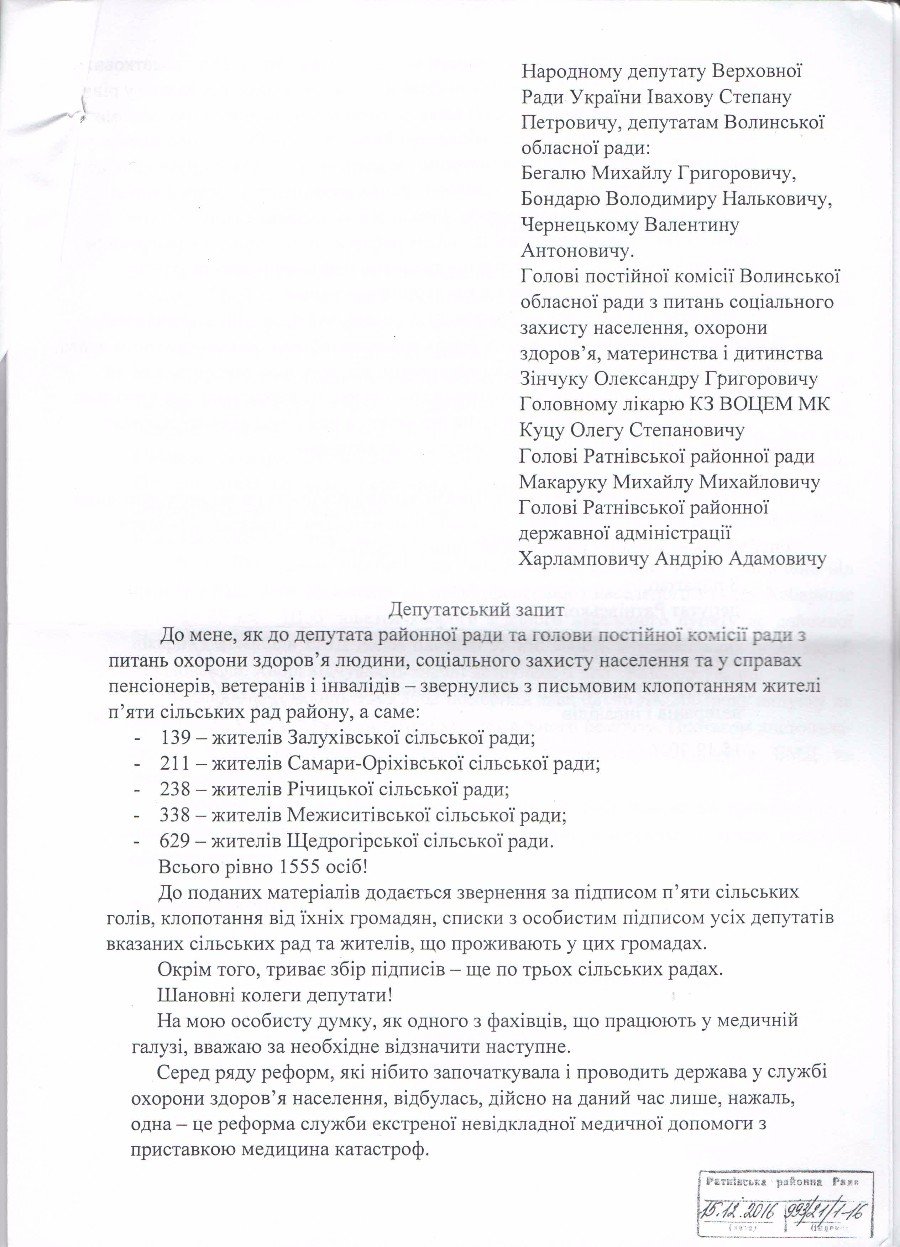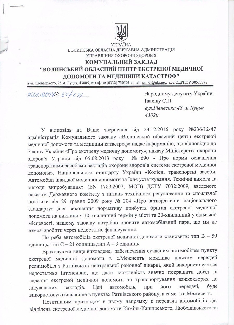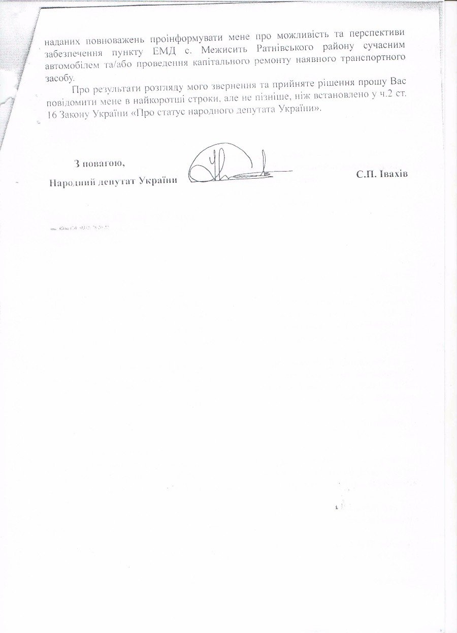 В грудні 2016 року до народного депутата Степана Івахіва звернувся голова Ратнівської районної ради, керівник місцевого осередку партії «УКРОП» Михайло Макарук з проханням посприяти, аби пункт швидкої допомоги у селі Межисить на Ратнівщині отримав реанімобіль. Під зверненням підписалися 1500 мешканців п’яти сільських рад, які обслуговує цей пункт екстреної медичної допомоги (ЕМД).