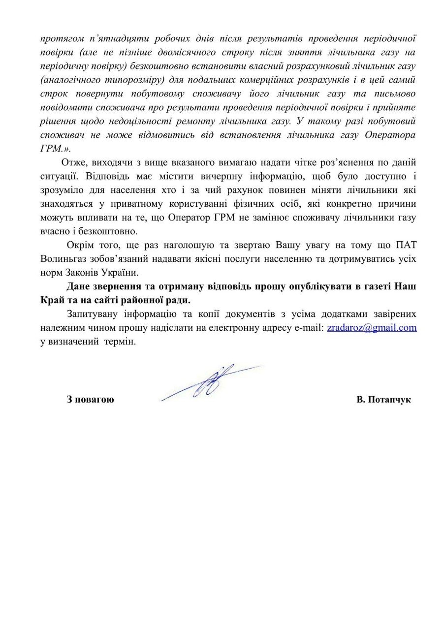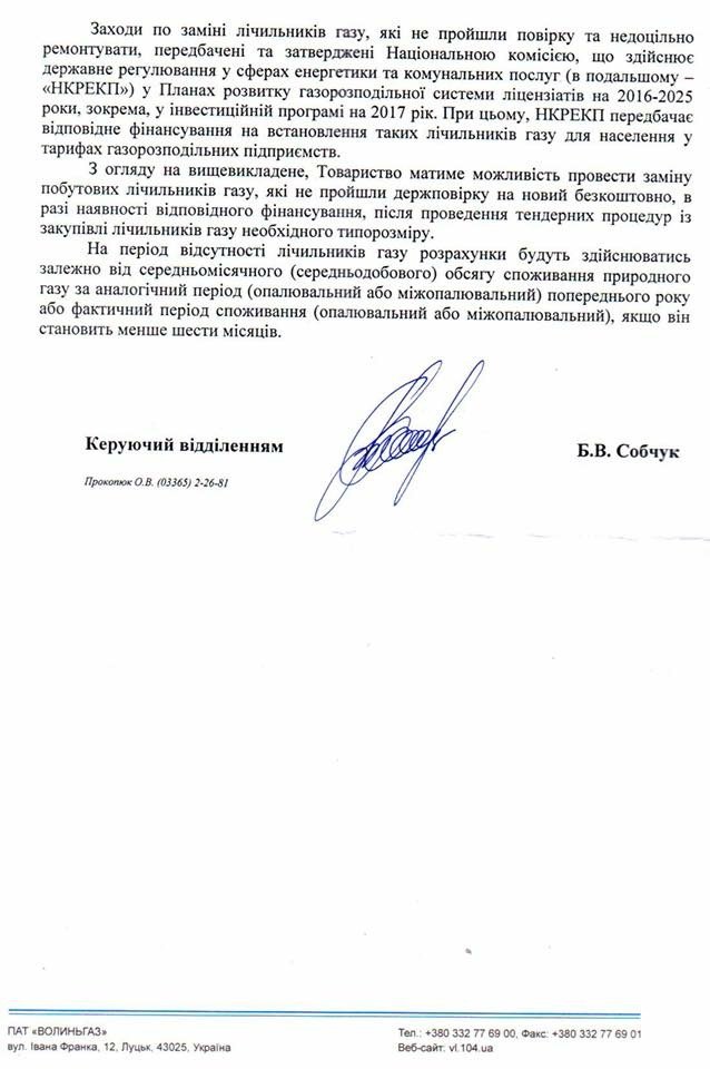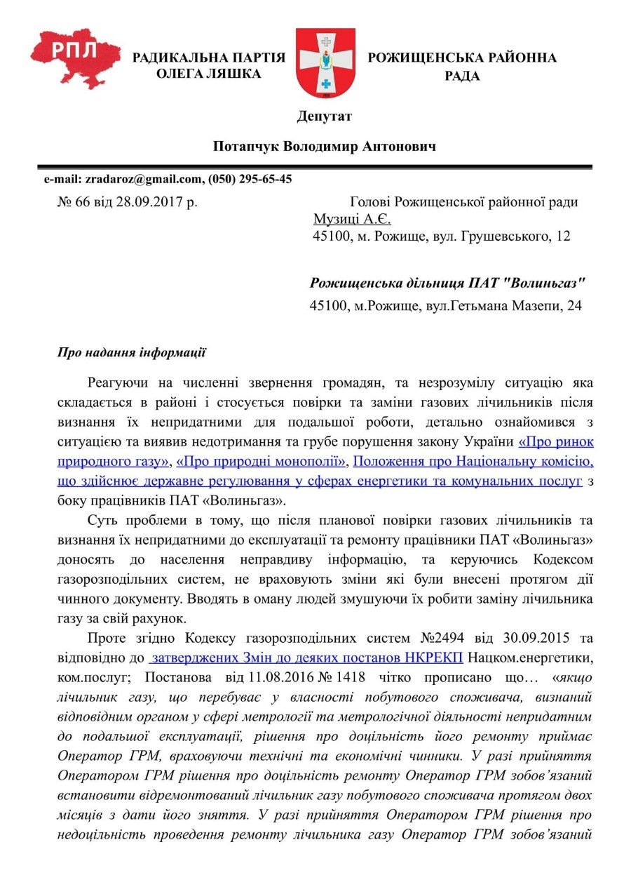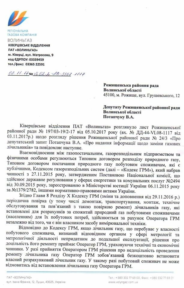 Депутат від РПЛ в Рожищенському районі Володимир Потапчук надсилав запит щодо лічильників безпосередньо «Волиньгазу». Підприємство відповіло: лічильники для людей безкоштовні!
