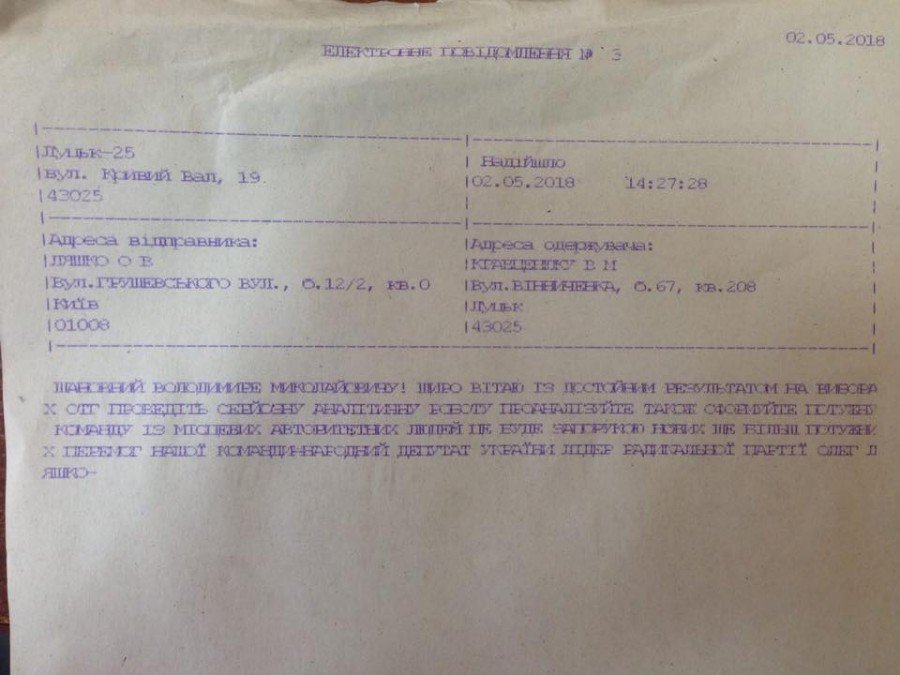Проте особливо приємно було отримати телеграму (сто років не отримував телеграм!) від Лідера Радикальної партії Олега Ляшка. В ній Ляшко особисто привітав мене та наш актив із гідним результатом.