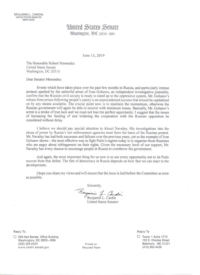 Таким чином, політична обстановка в Росії неминуче змінюється. З'являються реальні передумови того, що опозиція зможе вдало виступити на прийдешніх 8 вересня 2019 року регіональних виборах, а в разі фальсифікацій, організує протести по всій Росії. До речі, російські внутріполітичні події останніх місяців не були залишені поза увагою на Заході. Демократ Бенджамін Кардін попросив старшого члена Комітету Сенату США з міжнародних відносин Роберта Менендеса винести на обговорення питання щодо виділення додаткових коштів на підтримку російської опозиції, зокрема Олексія Навального. На думку Бенджаміна Кардіна, звільнення Голунова - відмінний шанс для наступного розвитку успіху в боротьбі проти Путіна.